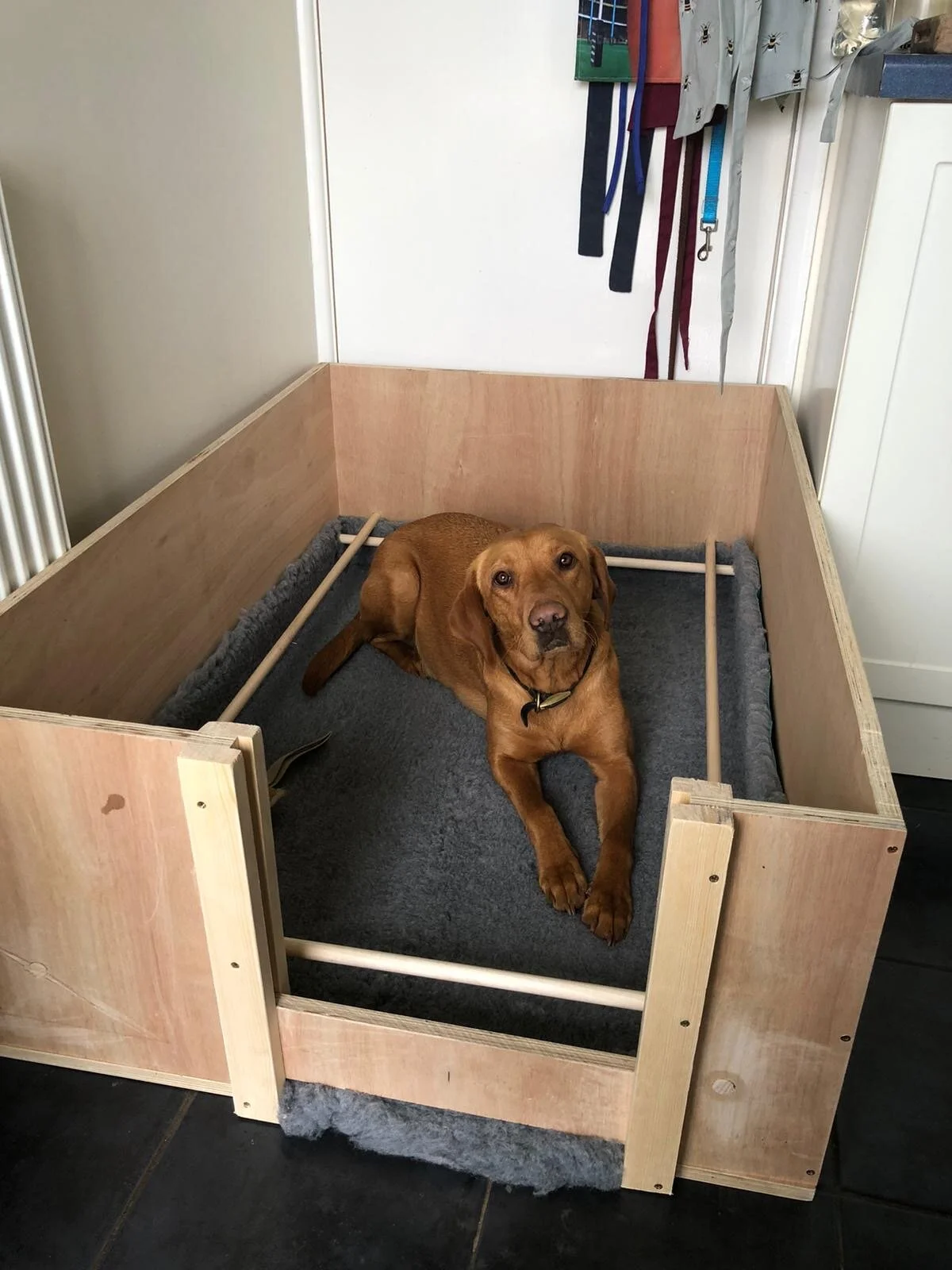 It’s a simple wooden framed box, with a runner around the inside so that there is no risk of Bee crushing any newborn puppies up against the sides by accident. There is an opening for Bee to get in and out of easily and we have made more slats to go in the doorway to keep the pups in as they get bigger! We’ve made it very comfy with a whelping mat and cushion and I think you can see that Bee is quite at home in it already!