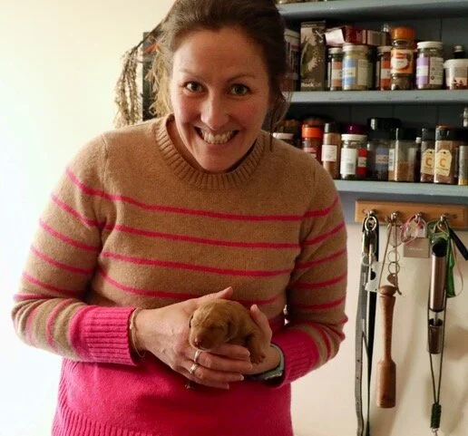 Well what a week it has been! We thought Bee was ready to give birth during last Monday evening as she had settled into her whelping box and her temperature had dropped a degree, which is a sign of going into labour. I spent Monday night getting up every time I heard a sound from her, so I got very little sleep. However, Bee’s gorgeous puppies started arriving from 16.50 on Tuesday 10th March. As I was busying myself in the kitchen, I noticed Bee contracting. I called to my husband, Frank, as I saw a tiny black bundle emerge. Our first little puppy had been born - a little black girl. Bee wasn’t sure of her role at this point, so we split open the sac and made sure the pup was breathing before we cut the umbilical cord. Bee was sniffing around her and slowly starting to lick her. It was utterly magical! As we were sat fascinated by this little creature, number two was born. A slightly larger and more robust golden boy came into the world. He looked two-tone from where his fur was rippled from being wet. Again, we assisted Bee getting him out of the sac and cutting his umbilical cord as she hesitated in dealing with this pup, but was licking him well once he was free of the placenta and sac.